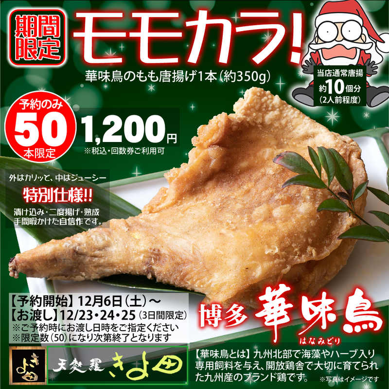 九州産ブランド「華味鳥」のもも(骨付)丸ごと1本を2度揚げした贅沢な逸品!約350gは当店通常唐揚げの約10個分(約2人前)を1,200円とお値打ち価格でご提供いたします。